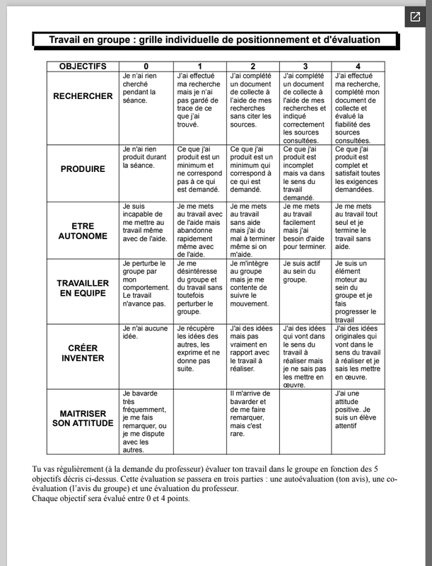 Travail en groupe : grille individuelle de positionnement et d'évaluation